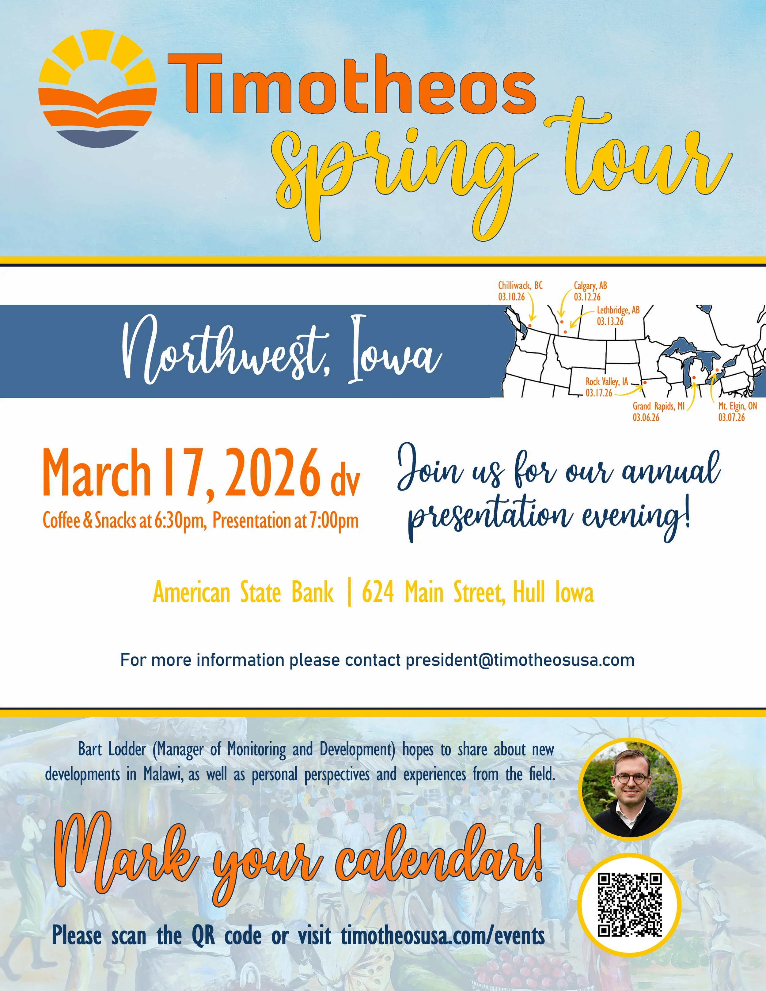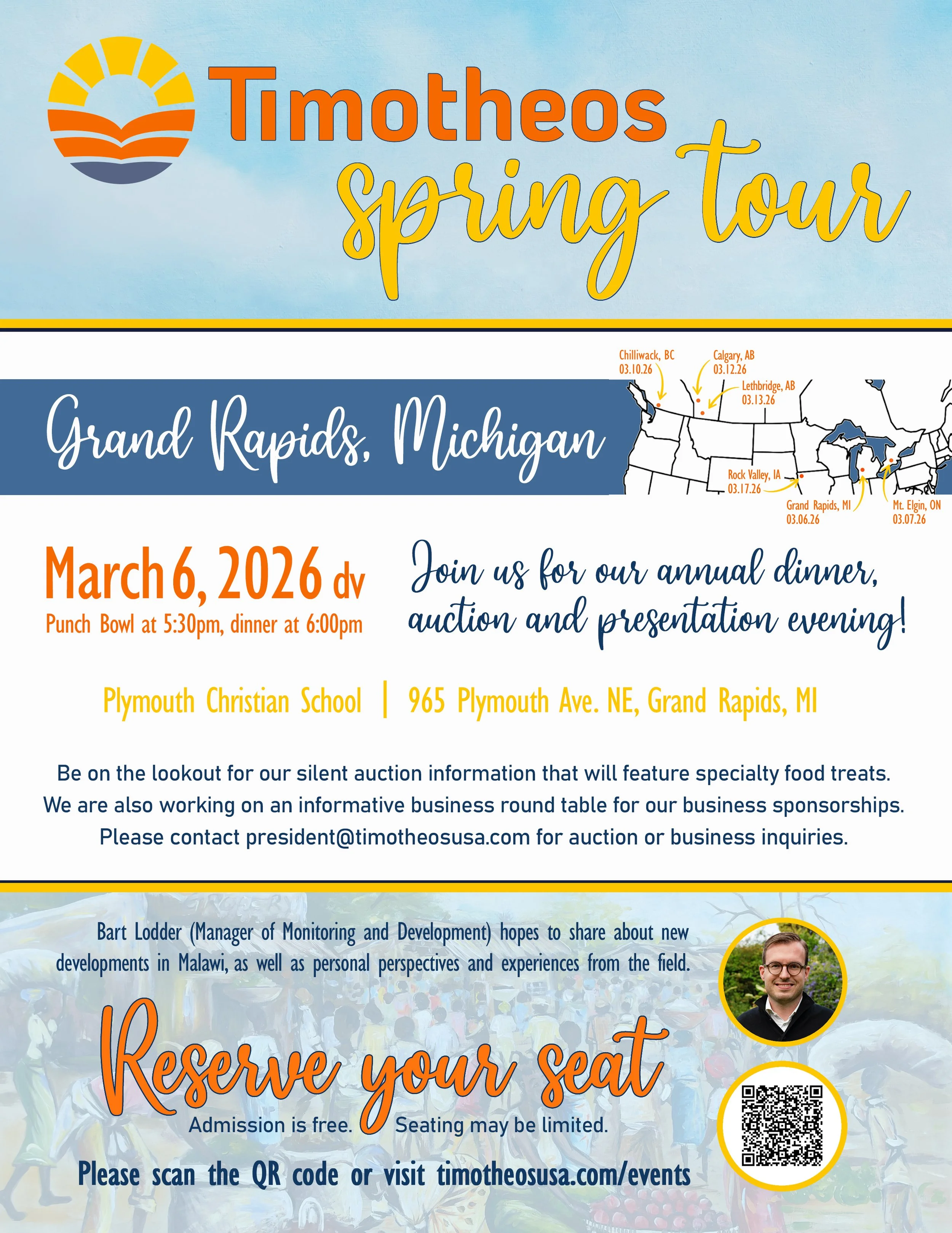 Join us for an evening of socializing, dinner and a presentation as part of our annual Spring Tour. Guests are invited to enjoy dinner followed by an exciting auction in support of Timotheos’ work in Malawi.